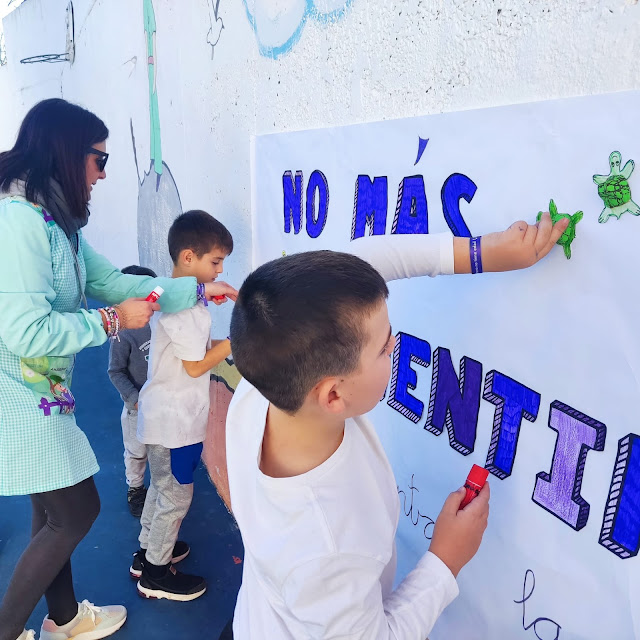 Hoy, los alumnos de Infantil, Primaria y Aula Específica han trabajado el cuento de Arturo y Clementina, que nos ha servido de inspiración para nuestro mural contra la violencia de género. Bajo el eslogan "no más Clementinas", los alumnos han elaborado su tortuga y la han ido pegando.